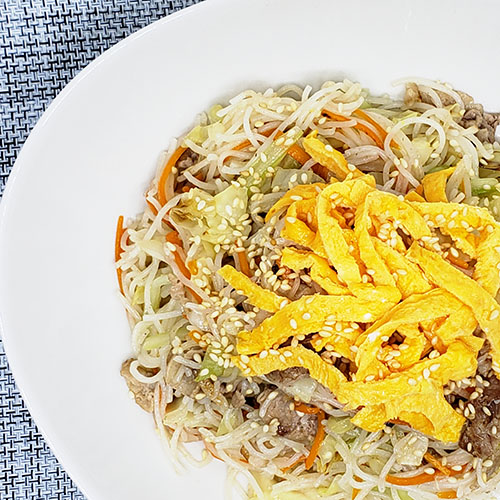 米粉用室溫水浸至能捏散,瀝乾水備用。
